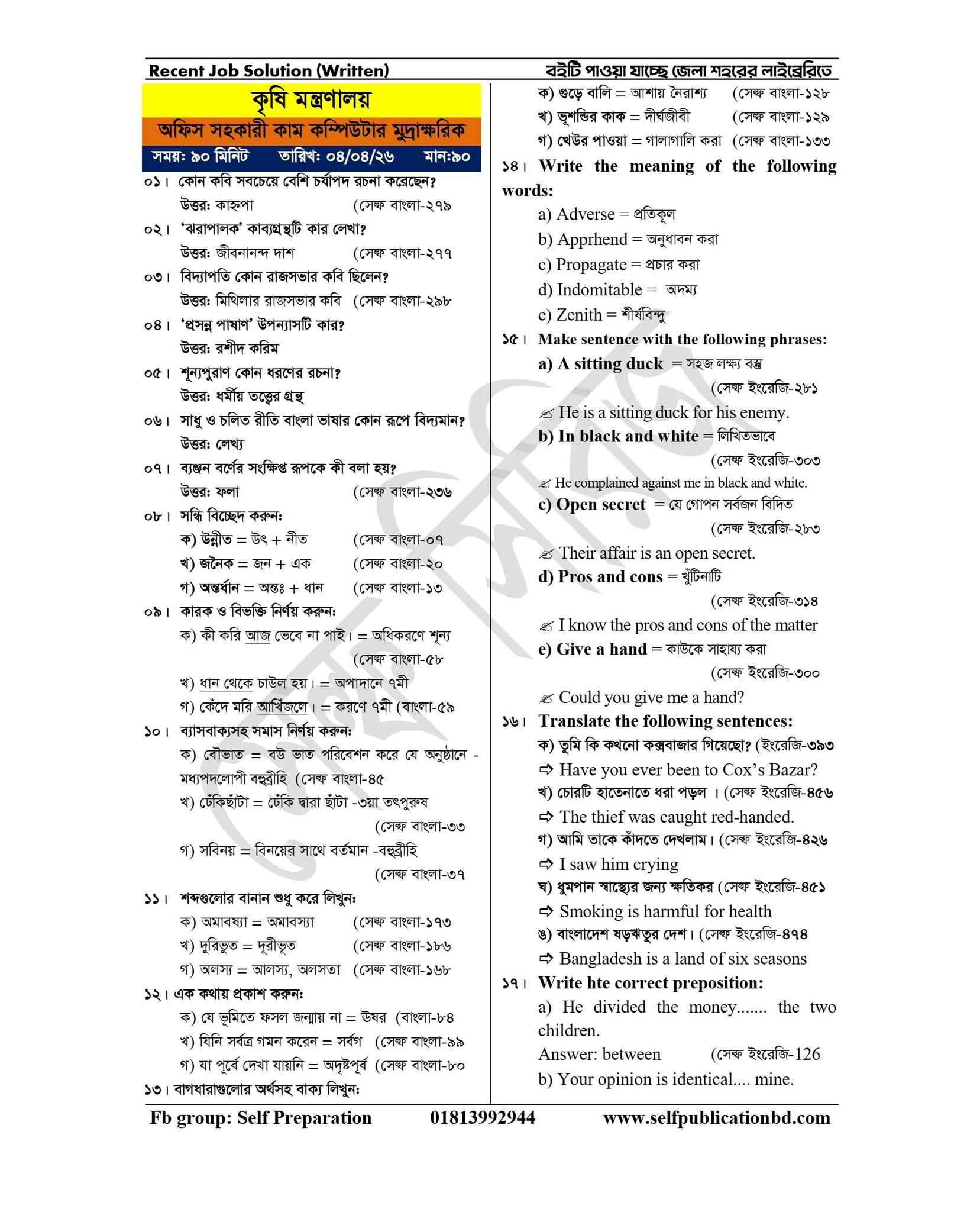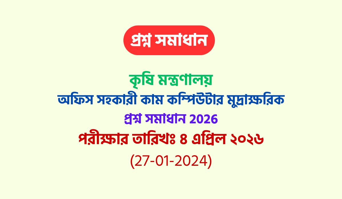 Share Facebook Twitter LinkedIn Pinterest Email কৃষি মন্ত্রণালয়ের অফিস সহকারী কাম কম্পিউটার মুদ্রাক্ষরিক নিয়োগ পরীক্ষার প্রশ্ন সমাধান পরীক্ষার তারিখঃ ৪ এপ্রিল ২০২৬ অফিস সহকারী কাম কম্পিউটার মুদ্রাক্ষরিক কৃষি মন্ত্রণালয় প্রশ্ন সমাধান 2026